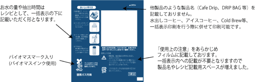 | 15g~20gを個包装充填できるアイス用コーヒーバッグです。 【コーヒーバッグの特徴】 1.窒素充填が可能。(残留酸素濃度1%未満) 2.一括表示を印字するので、1個づつでの販売が可能。 3.アフタープリント単色印刷が可能。 従来の水出しコーヒーバッグですと、窒素充填ができなかった為、 バルブ付きの袋に入れる事で、コーヒー粉から発生するガスにより袋内の空気を外部に放出する必要がございましたが、窒素充填が可能となりますので、パッキング直後で残留酸素濃度1%未満となります。 また、販売する際、水出しコーヒーバッグの入った袋に、一括表示や標品ラベルをシールで貼る必要がございましたが、アフタープリント単色印刷や一括表示をあらかじめ印刷する事ができますので、そのまま1個単位で販売する事ができます。 オリジナルフィルムへの充填も可能でございます。 |