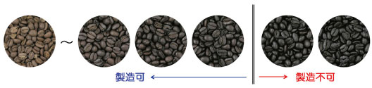 | 充填機の構造上、原料の焙煎度合いと挽き目につきまして以下の制限がございます 【焙煎度合い】 焙煎度合いが深すぎますと、コーヒーから生じる油分や静電気の影響により充填機内でのコーヒー粉の付着が顕著となり、適切な充填を行う事ができません。 その為、フレンチローストより浅い焙煎度合いの原料のみ、製造可能となります。